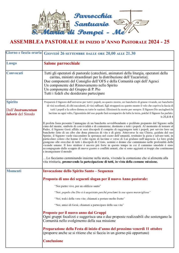 24 Settembre 2024Assemblea Pastorale di inizio Anno Pastorale 2024 – 2025 Giovedì 26 settembre dalle ore 20 alle ore 21,30