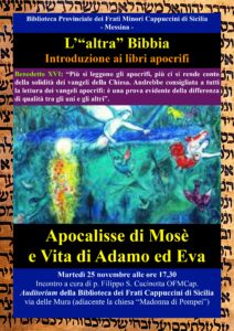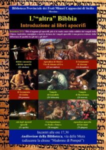 Anche quest’anno la Biblioteca di Messina dei Frati Minori Cappuccini offre un nuovo ciclo di “Invito alla lettura”, proponendo il tema: L’”Altra Bibbia”. Introduzione alla lettura dei libri biblici apocrifi Un tema indubbiamente interessante non solo sul piano religioso. Si tratta di rivisitare testi che di fatto hanno contribuito a ricostruire ambiti biblici a volte […]