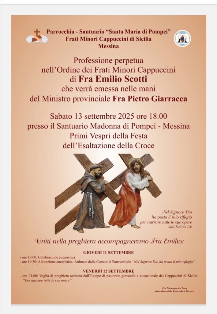 1 Settembre 2025NewsProfessione perpetua di fra Emilio Scotti .. Sabato 13 Settembre 2025 .. —— alle ore 18,00 – — – – – == Professione perpetua == —- di fra Emilio Scotti – – – –